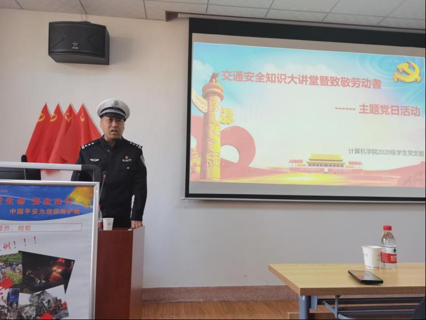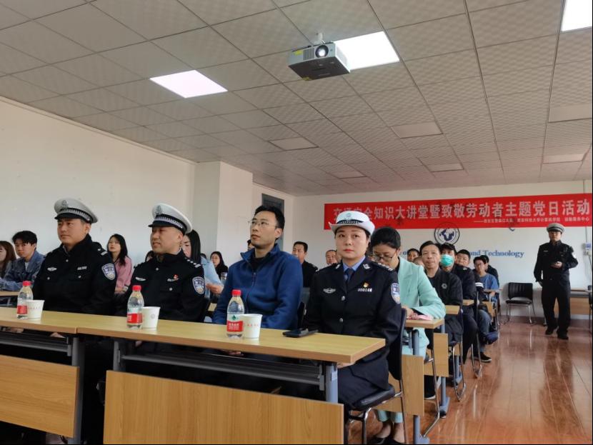 429日上午,计算机公司与后勤处联合举办的交通安全知识大讲堂暨致敬劳动者主题党日活动,在临潼骊山校园在计算机公司512学术报告厅举行。西安交警曲江大队副队长谢勇涛、曲江大队西影路中队副队长崔浩哲、民警何莺歌、王斌,伟德官方网站后勤处副处长孙涛、后勤处运输服务中心、计算机公司师生党员和入党积极分子代表60余人参加此次活动。