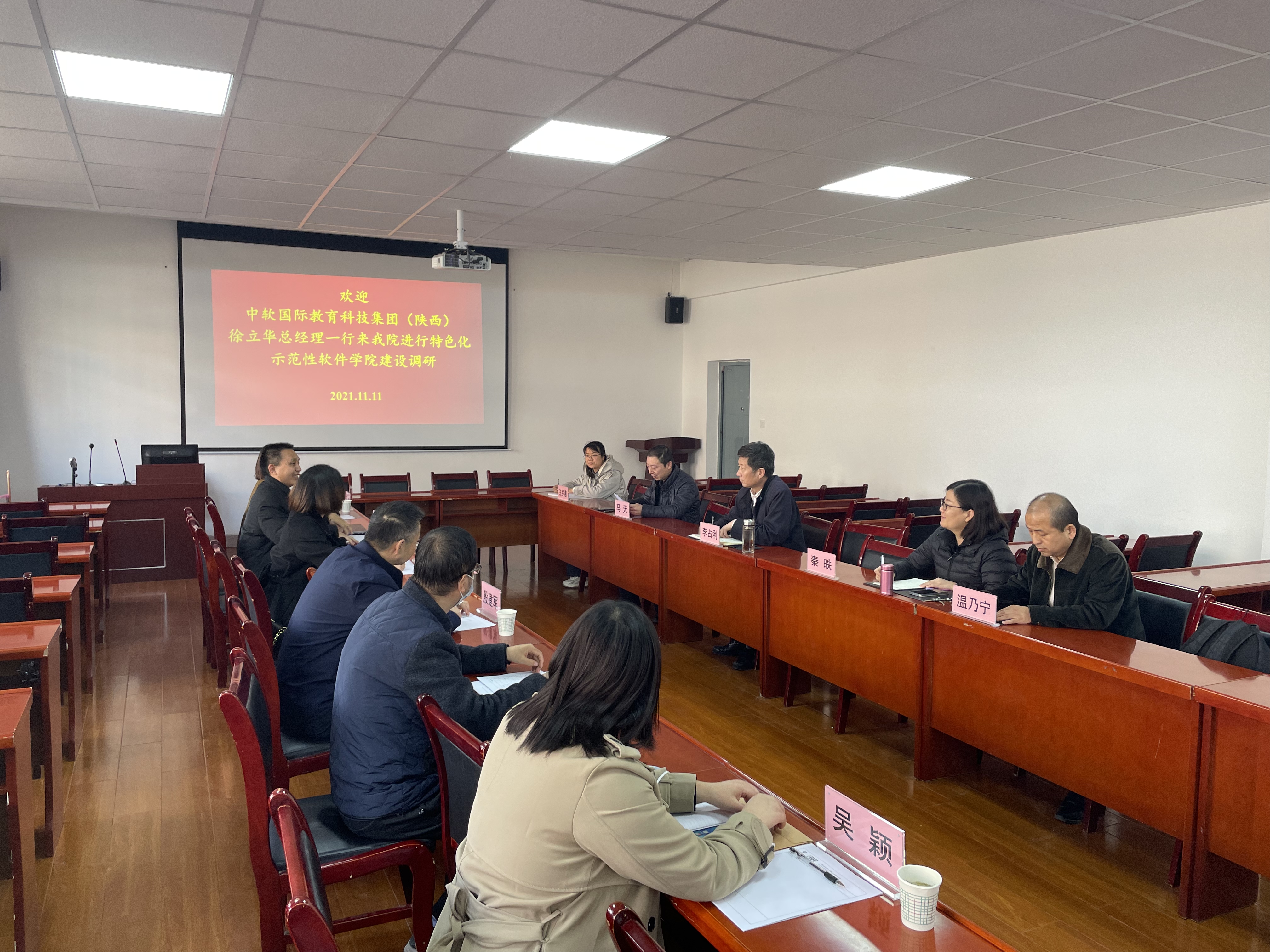 2021年11月11日下午中软国际教育科技集团(陕西)总经理徐立华带队,专家方长青、执行董事长殷建军、校企总监王楠、解决方案总监刘枫、校企经理吴颖等一行,来公司进行特色化示范性软件公司建设调研。