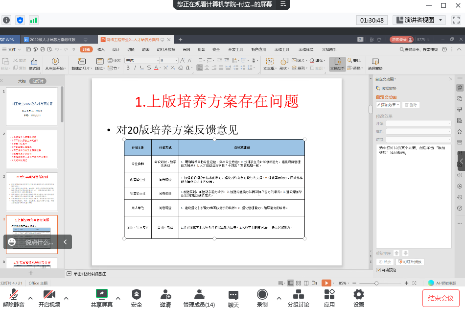 会上,各系主任针对专家和教务处提出的意见,对本专业人才培养方案进行修改之处做出具体说明。参会的领导对本次培养方案修订工作给予了充分肯定,教授委员会委员也从方案整体格式的统一性、培养目标表述的准确性、课程体系设置的完整性、实践课比例达标情况以及核心课程设置的数量和科学性等方面提出意见,参会人员充分沟通交流,进一步深刻理解2022版培养方案及课程大纲制定的重要性,大家统一认识,确保2022版本科人才培养方案和课程大纲高质量完成。