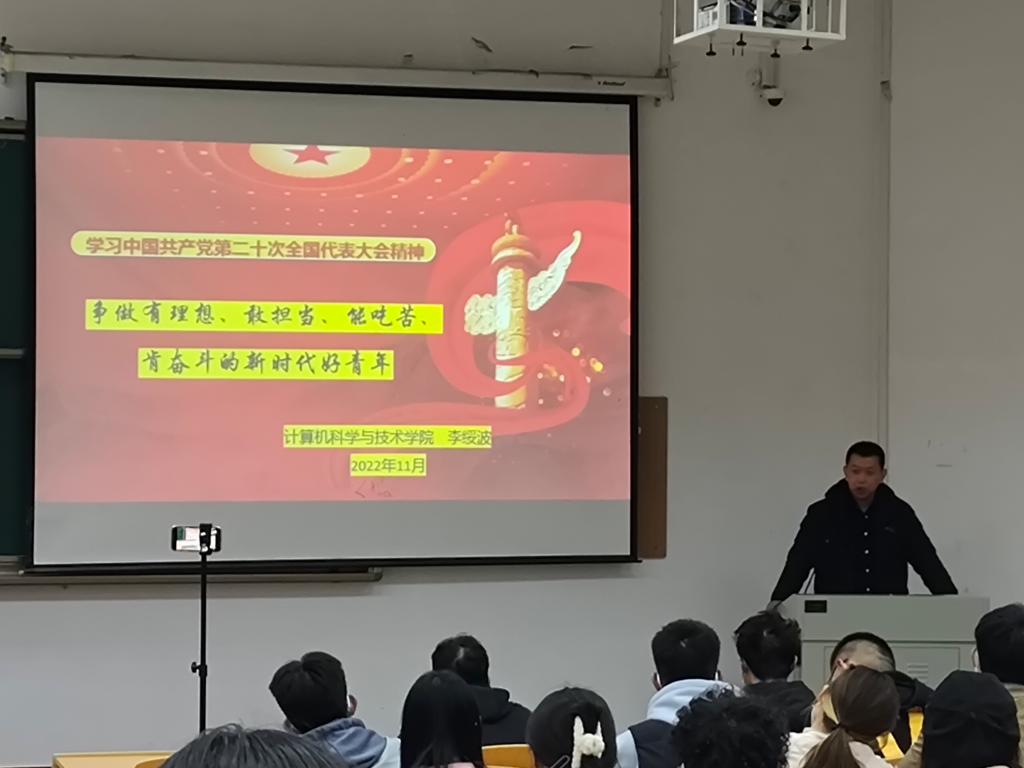 11月21日晚,计算机公司在临潼校区骊山校园9教101进行了第57期初党的第一次党课,公司党委书记李绥波是此次主题为《学习中国共产党第二十次全国代表大会精神,争做有理想、敢担当、能吃苦、肯奋斗的新时代好青年》党课的主讲人。本期入党积极分子培训班学员共102名同学参加学习,还有100余名员工党员在线参加党课接受再教育。