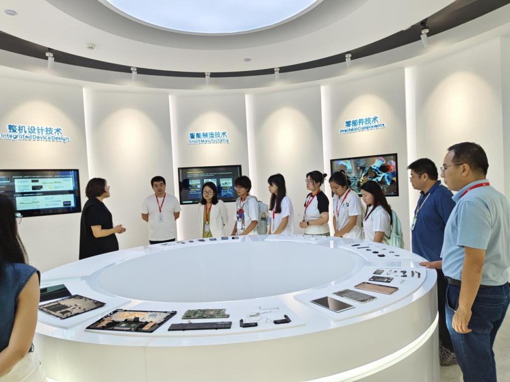在张春芹的带领下,实践团有序参观了公司的公共办公环境、华勤技术产品发展展览馆、测试服务器、交换器实验室等区域。参观过程中,张春芹就生产设备的运行及全自动轴承装配检测线进行了讲解与交流。整个参观过程不仅让师生们对华勤技术有了更加全面而深入的认识,也为大家提供了一个近距离接触行业动态、感受科技魅力的宝贵机会。