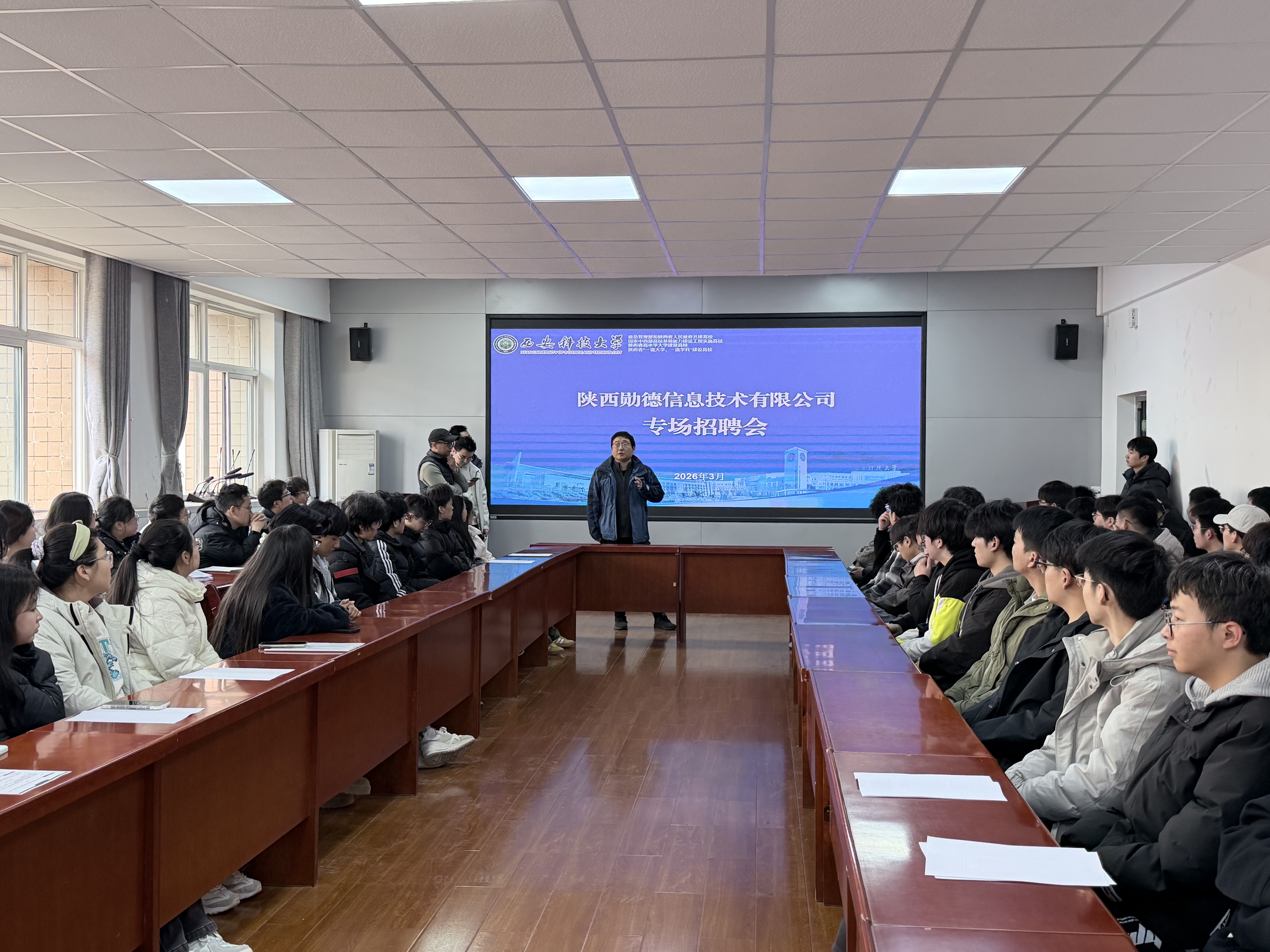 3月4日,bevictor伟德邀请陕西勋德信息技术有限公司进校举办专场招聘会。陕西勋德信息技术有限公司总经理李波一行四人,人工智能公司党委副书记郭胜忠、相关毕业班辅导员及2026届求职毕业生参与招聘活动。