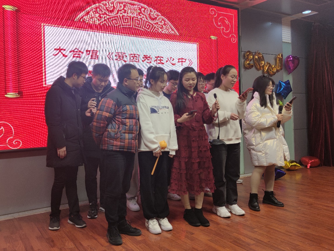 晚会还穿插了一些游戏环节,如看题目抢话筒答题、听前奏猜歌名等等,除此之外,为了进一步调动全场的气氛,现场进行了抽奖游戏,最后晚会在研究生会全体成员合唱《爱因为在心中》中圆满闭幕。