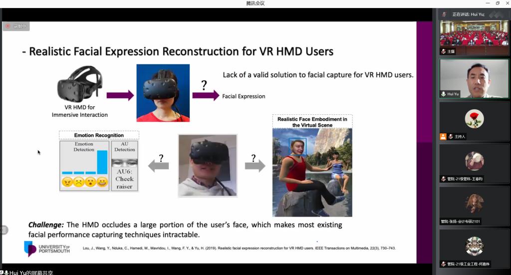于慧主要从理解和感知情感等相关问题的视觉信息与语义解释展开论述。探讨了在人工智能大背景下,视觉开发、机器学习、虚拟现实、脑机交互以及机器人技术等方面的应用,讨论了基于图像的3D人脸重建、用于人脸情绪检测的多模态融合方法,以及在VR/AR场景中的应用。
