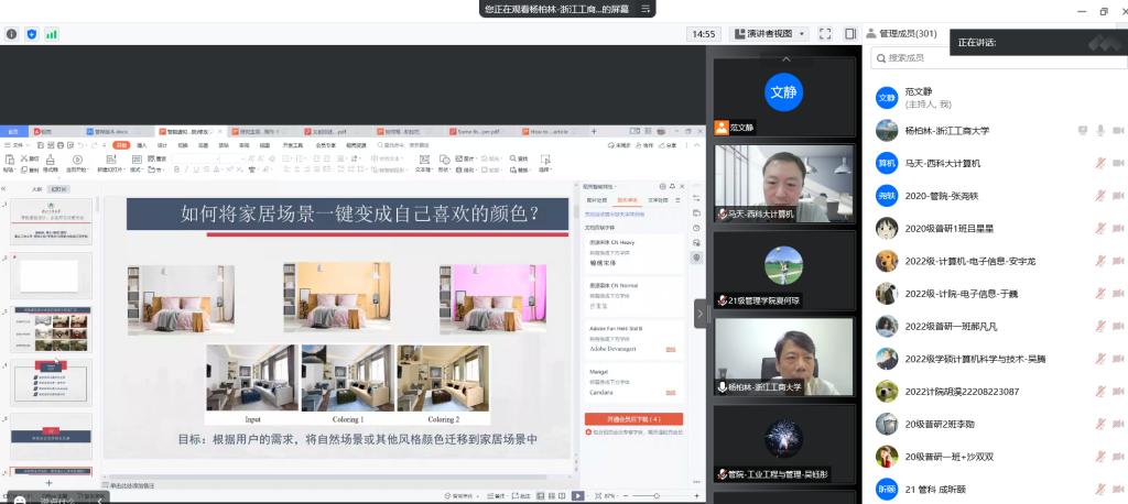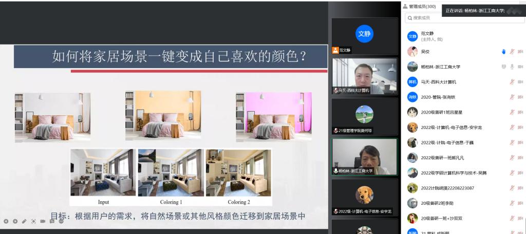 杨教授主要从本报告主要从智能家居场景颜色迁移、智能家居场景色彩和谐度、智能家居场景一键布局三个维度来阐述智能虚拟设计的相关关键技术。