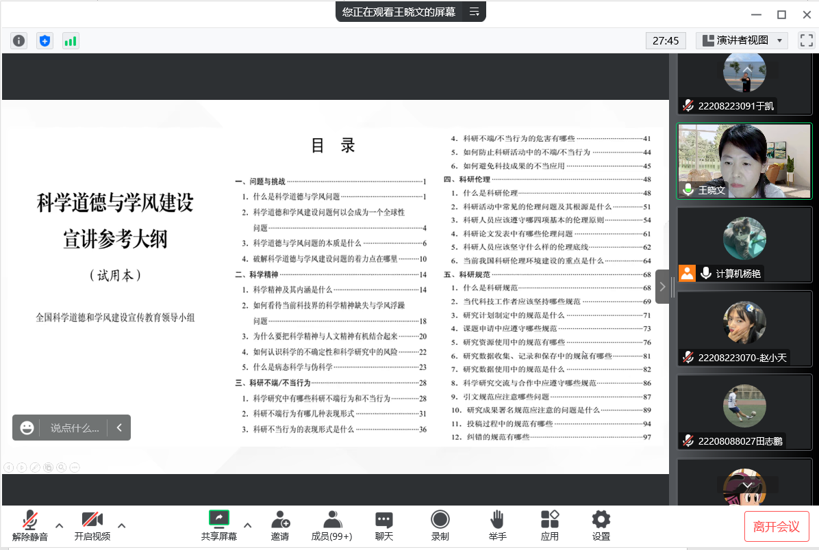 10月28日,伟德官方网站王晓文老师为公司2022级研究生在线做了题为《学术规范与学术道德建设》的学术报告。报告会由bevictor伟德公司主办,杨艳主持,全校160余名研究生及教师聆听了报告。