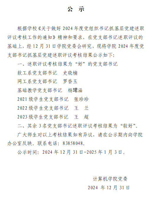 2024年度党支部书记抓基层党建述职评议考核结果公示